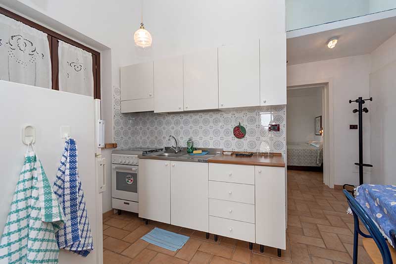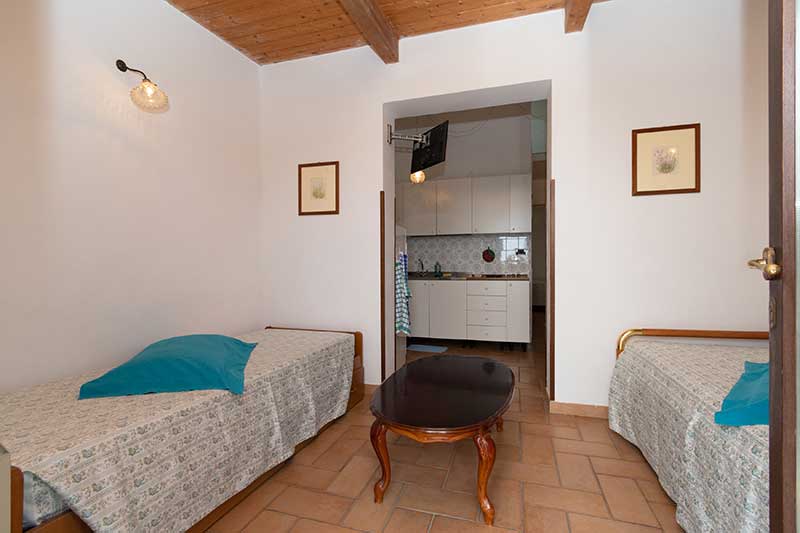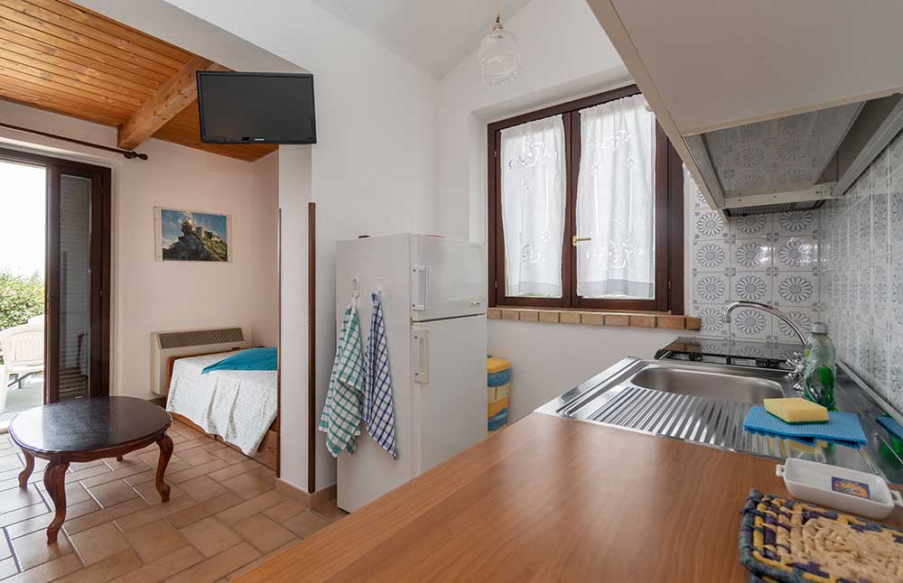 L'appartamento è composto da un soggiorno-cucina (cucina completamente attrezzata), un bagno con doccia, una camera con letto matrimoniale e un letto singolo.